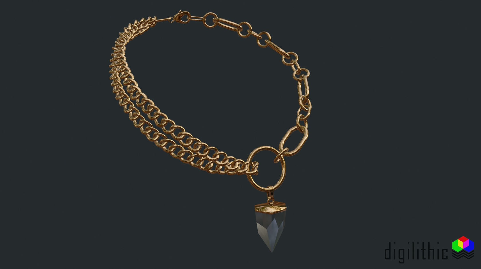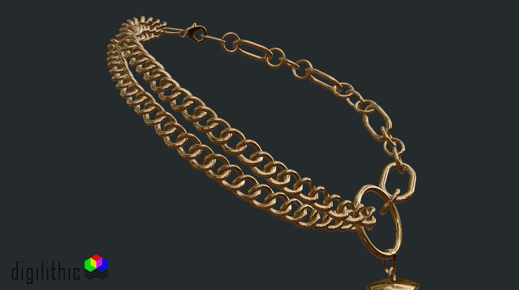 Chain links and the fastener were reproduced exact to the millimeter. We decided to present the object as it would naturally lay around the neck of the wearer.
